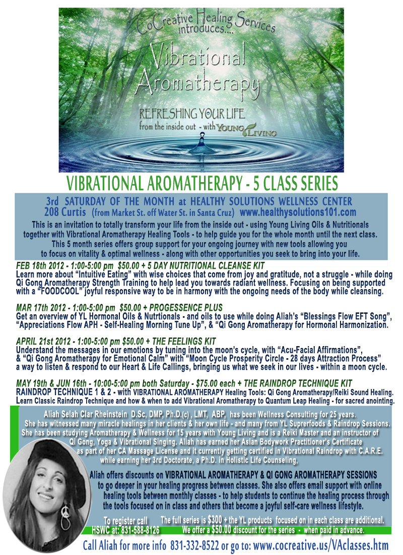 Young Living Products we will focus on: 5 Day Nutritional Cleanse - please wait to start doing the cleanse - we will begin together on the New Moon - on Feb 21st. Other YL Products we will be learning about: Slique Tea & Ocotea/Grapefruit YL Essential Oils for Weight Management, & Enzyme choices. We will also go over the depth of research for all the health conditions that benefit from drinking NingXia Red daily - that you will get to taste in the class along with a smoothie made with Balanced Complete (both come in the 5 Day Nutritional Cleanse Kit). And we will talk about delicious options for your smoothies. Vibrational Aromatherapy Healing Tool: "Blessings FLow EFT Tapping Song for Being In-Ease" and FOODCOOL overview - cleansing concepts, shopping & planning easy meals with FOODCOOL upgrades of favorite recipes into ones you love that are healthy for you. Vibrational Aromatherapy Qi Gong: for Strength Training Acu-Tuning Forks: We will first learn about the 4 All Purpose Sets: OHM Set, DNA Reprogramming Set, Angel/Crystal Tuner Set & Ozone Set. Then move on to the ones focusing our topic: Healthy Organ Set - including Muscle Building, Fat Melting, & Energy Cultivating - used with specific Essential Oils & Superfoods to help with digestion and weight management goals. ALIAH HAS BEEN A WELLNESS CONSULTANT FOR OVER 25 YEARS. SHE GAVE COPIES OF HER BOOK FOODCOOL TO KNOWN TOURING MUSICIANS TO HELP THEM ON TOUR AND IN THEIR LIVES. IF YOU ARE INTERESTED IN A WELLNESS CONSULTING SESSION WITH ALIAH - GO TO PERSONAL SOURCE WELLNESS: www.personalsource.com Class 2: Mental/Hormonal Focus Young Living Products we will focus on: Pregessence Plus Other YL Products we will be learning about: Hormonal Oils - Clary Sage, Endo-Flex & other hormonal oils & supplements for hormonal needs from Young Living Vibrational Aromatherapy Healing Tool: "Blessings FLow EFT Tapping Song to calm mental chatter" & Colors & Sounds for Restful Sleep Vibrational Aromatherapy Qi Gong: for Restuful Sleep & Hormonal Harmonization Acu-Tuning Forks focused on our topic: We will review learning about the 4 All Purpose Sets: OHM Set, DNA Reprogramming Set, Angel/Crystal Tuner Set & Ozone Set. Then move on to the ones focusing our topic: Endocrine Set, Brainwave Set, & Mineral Set, including a custom one - "Indium" - from the periodic table that feeds the Pituitary Gland - helping it to make all the hormones that are needed - naturally occurring yet diminishing with age. We will see how to blend the Mineral set with the Healthy Organs Set & 4 All-Purpose Sets. Aliah has been lead to develop a Hormonal Harmonization Blend... of natural nutrents... that you take by taste... come to this class to learn more about it or contact Aliah. POSITIVE THINKING, NUTRIENTS, & OUR HORMONAL NEEDS - ALIAH & HER MD ARE DOING A YEAR LONG INFORMAL STUDY - IF YOU ARE INTERESTED IN PARTICIPATING. HER DOCTOR IS JUST AS EXCITED ABOUT ALIAH'S LAB RESULTS THAT SHOW HER IMPROVEMENTS IN HYPOTHYROIDISM & HASHIMOTO'S. THIS LINK BELOW IS A PAGE EXPLAINING WHAT THE HORMONAL HARMONIZATION BLEND IS... AND THE MEDICAL STUDIES THAT BACKED UP WHAT HER INTUITION AND GUIDANCE LEAD HER TO FIND. ALIAH IS DEDICATED TO SHARING THIS INFORMATION WITH AS MANY WHO ARE OPEN TO IT.... THIS HORMONAL BLEND OF HEALHTY NATURAL NUTRIENTS THAT YOU TAKE BY TASTE - SO YOU GET JUST NUTRIENTS THAT YOU NEED FOR THAT MOMENT - FOR THIS SHE WAS GIVEN AN HONORARY DOCTORATE IN INTEGRATIVE MEDICINE READ MORE: www.personalsource.com/currentresearch.htm Class 3: Emotional/Manifesting Focus Young Living Products we will focus on: THE FEELINGS KIT Other YL Products we will be learning about: Special Oils with wonderful names that tell you what they are for: Abundance, Magnify your purpose, Grounding, Gratitude, etc. Vibrational Aromatherapy Healing Tool: "Blessings Flow EFT Tapping Song for Manifesting" & "The 28 Day Moon Cycle & CoCreating Home Life Prosperity & Affirming Au-Facial" Vibrational Aromatherapy Qi Gong: for Home LIfe Prosperity& Emotional Calm Acu-Tuning Forks focused on our topic: We will review learning about the 4 All Purpose Sets: OHM Set, DNA Reprogramming Set, Angel/Crystal Tuner Set & Ozone Set. Then, move on to the ones focusing our topic: Moon Acu-Tuning Fork from the Cosmic Planetary Set, and Fibonacci Set (The spiral set for deep inner changes). We will use the moon tuning fork with the All-Purpose Sets and demonstrate a Fibonacci Session Dophin Healing using the Brainwave, Healthy Organs & Minerals Sets if there are health needs that come up in our prosperity attuning spiral - using the YL Essential oil Abundance and the Essential Oils from the Feelings Kit plus others you may want to add that serve your specific needs. MOON CYCLE QI GONG FOR HOME LIFE PROSPTERITY WORKSHOP TEACHES YOU HOW TO
